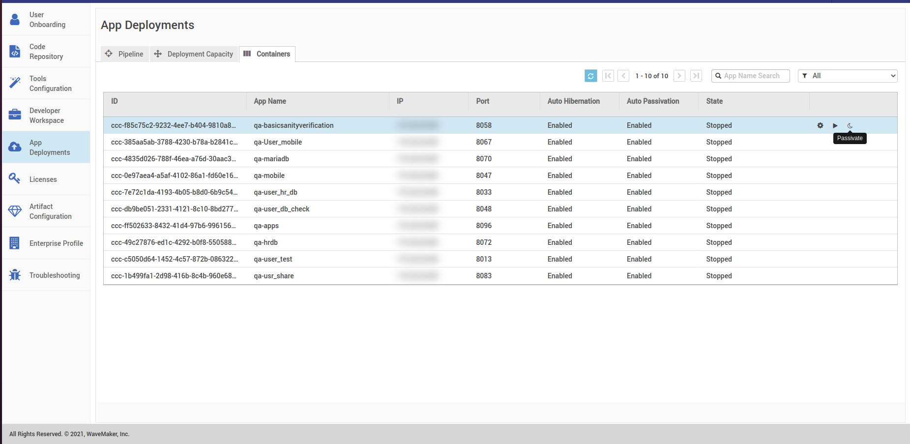 • Wait till the state is changed to stop as shown in the image below. After the container state changes to stop, you can passivate them by hitting the passivate button.